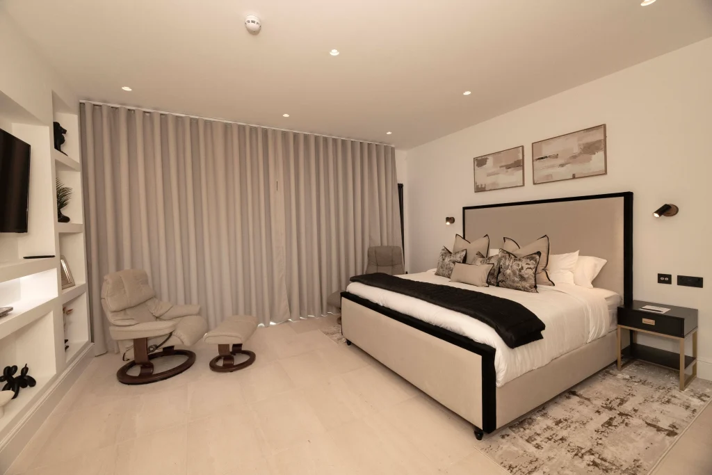 Contemporary neutrals with warm wood finishes – perfect for longer stays.